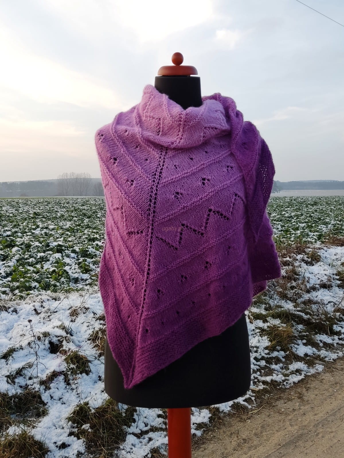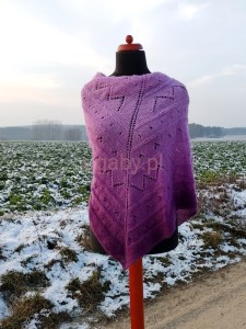 Przedstawiamy ręcznie dzierganą chustę, która łączy wyrafinowany styl z przyjemnym ciepłem. Jej design opiera się na modnym efekcie ombre, gdzie odcienie fioletu przechodzą harmonijnie od jasnej, pastelowej lawendy w górnej części, do nasyconego, ciemnego fioletu na brzegach.