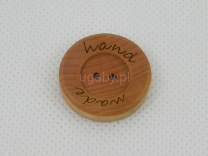 Ten guzik to idealne połączenie funkcjonalności i osobistej sygnatury. Wykonany z drewna o głębszym, cieplejszym odcieniu, posiada wyraźny, grawerowany napis otaczający centralne dziurki do mocowania. Naturalne usłojenie drewna i jego gładka powierzchnia dodają projektom autentyczności i szlachetności.