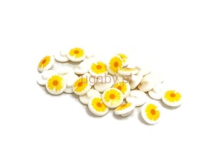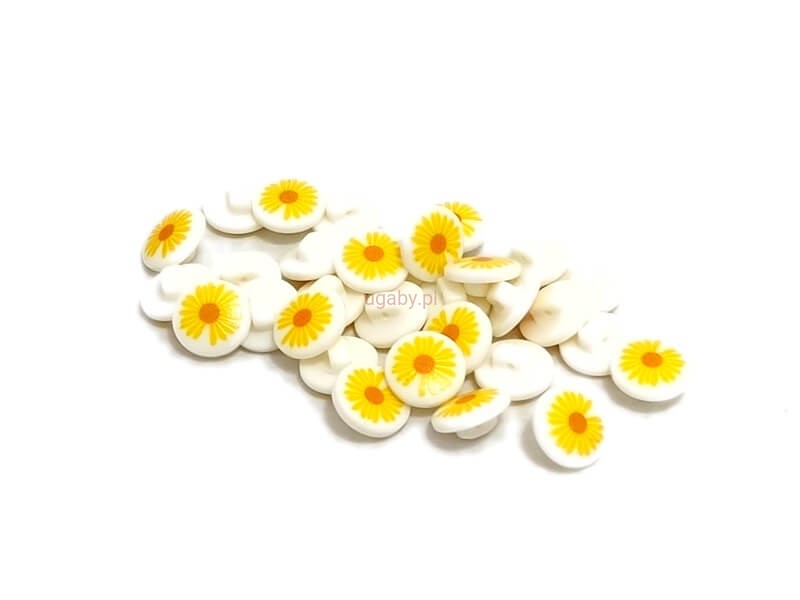 Te małe guziczki o średnicy około 11 mm to idealny sposób na dodanie lekkości i świeżości każdej kreacji. Mają białą bazę i jaskrawy, żółto-pomarańczowy nadruk kwiatu, co sprawia, że wyglądają jak małe słoneczka. Ich niewielki rozmiar i dekoracyjny kształt sprawiają, że są subtelnym, ale radosnym detalem.