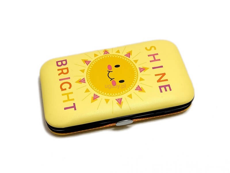 Akcesoria są bezpiecznie przechowywane w solidnym, metalowym etui z zatrzaskiem, które chroni zawartość przed zgubieniem i uszkodzeniem. Wnętrze wyłożone zostało eleganckim, żółto-musztardowym welurem, który nie tylko estetycznie się prezentuje, ale także stabilizuje narzędzia. Etui jest płaskie i kompaktowe, dzięki czemu bez trudu zmieści się w kieszeni, kosmetyczce lub podręcznym bagażu.