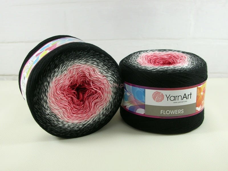 YarnArt Flowers to przędza typu „cake”, która wyróżnia się długimi i płynnymi przejściami kolorystycznymi. Skład łączący bawełnę (55%) oraz akryl (45%) sprawia, że gotowe wyroby są miękkie, przewiewne i zachowują swój kształt. Konstrukcja oparta na czterech lekko skręconych nitkach pozwala na uzyskanie efektu gradientu, w którym barwy przenikają się wzajemnie w sposób subtelny.